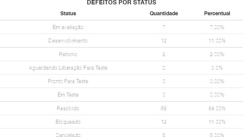 É fundamental saber o percentual de defeitos resolvidos para medir a “saúde” do projeto de teste. Neste caso, quanto maior a quantidade de erros corrigidos, maior é a probabilidade de o software estar com a qualidade adequada. É interessante visualizar também a quantidade de defeitos que estão em aberto, a fim de ter uma visão macro do projeto relativo ao que precisa ser solucionado.